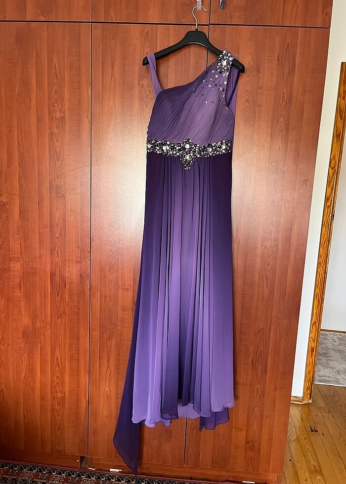 Çok önceden alınan bir abiye. Arkasındaki tül çıkarılabilir aslında tek omuz. Diğer mor parçayı kendim ekledim çıkarılabilir. Pensleri sökülebilir .bir sıkıntısı yok.