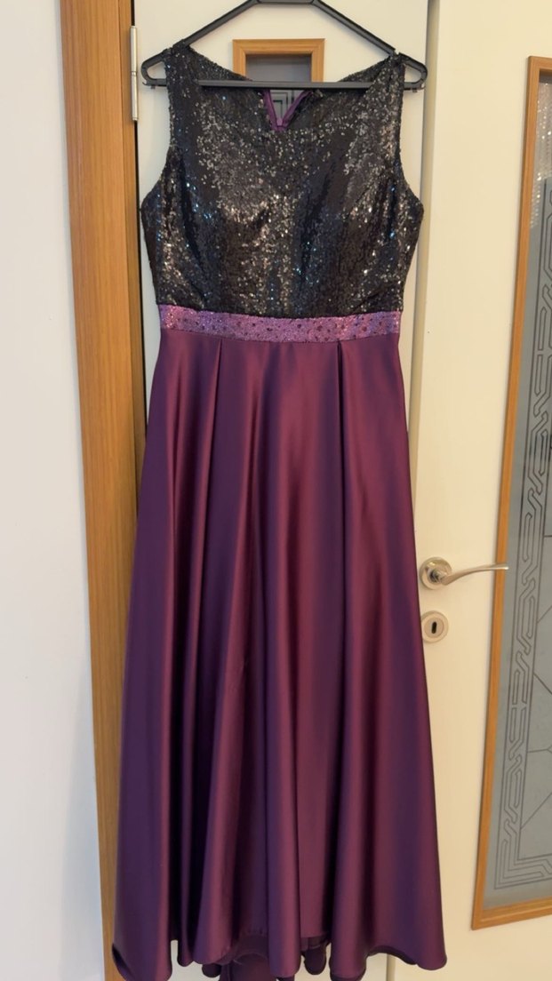Mor uzun abiye elbise, v yaka ve kolsuzdur. Üst kısmı Pul işlemeli ve parlak detaylı, etek kısmı drapeli ve klasik şıklık sunar. Düğün için uygundur.✨