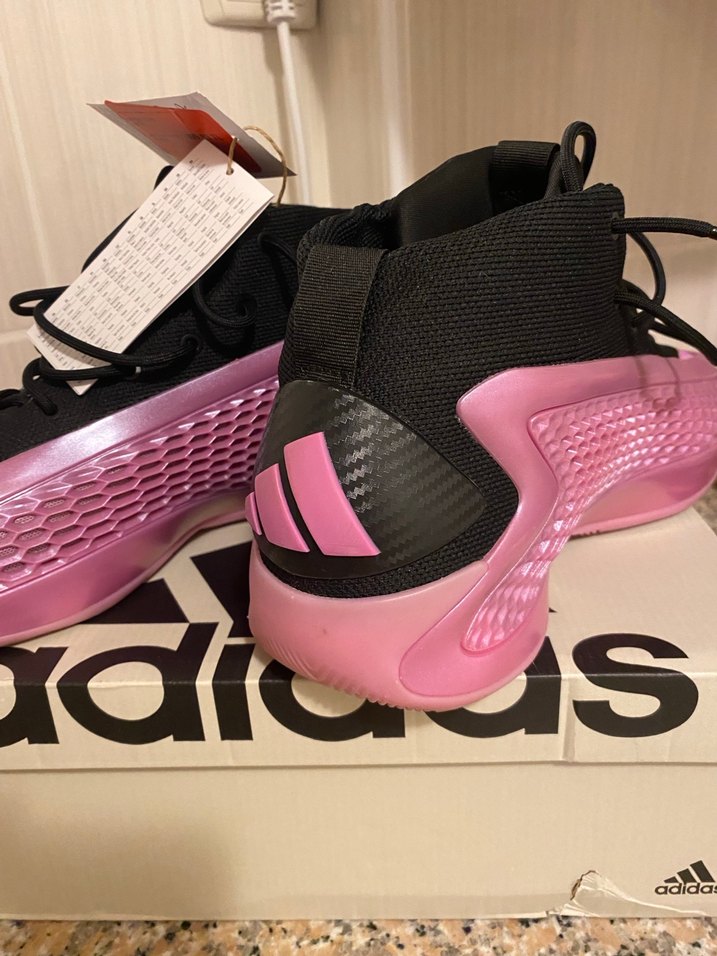 Pembe baskılı desenli, bağcıklı Adidas basketbol ayakkabıları, kauçuk tabanlı ve spor ile sokak stili arasında bir kombin sunar. Trend belirleyiciler için ideal.