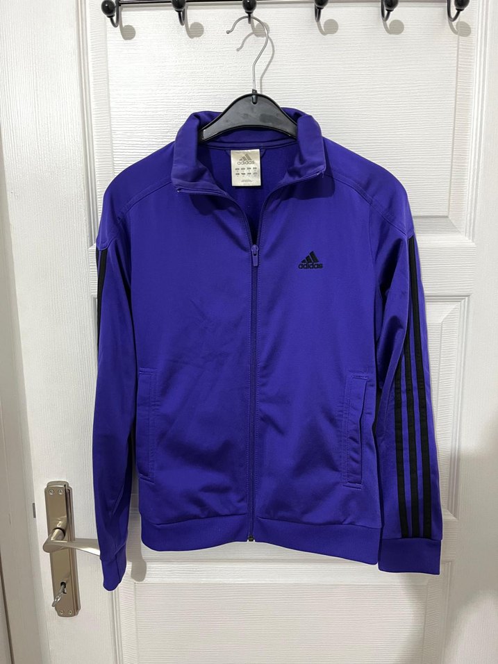Mor renkli Adidas fermuarlı ceket, uzun kollu ve yüksek yakalıdır. Yumuşak fleece kumaştan yapılmış, kollarda siyah baskılı çizgiler bulunur. Spor ve günlük kombinlere uygundur. ♀️Orijinal Adidas Ceket