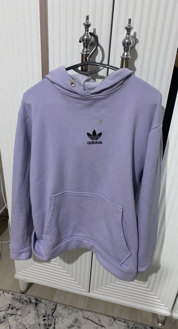 Mor Adidas kapüşonlu sweatshirt, yumuşak kumaştan, rahat kesimli ve cepli. Uzun kollu, günlük kullanım için ideal, şık ve rahat bir görünüm sunar. Lekssi var diye satıyom