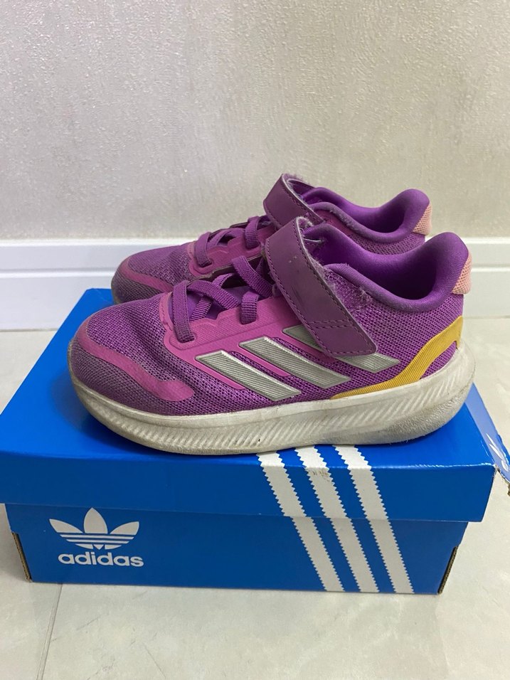 Mor renkli Adidas kız çocuk spor ayakkabısı, renkli baskılı detaylar ve velcro kapama özelliği ile sokak modasına uygun. 25.5 numara