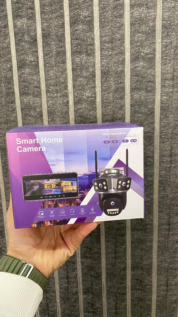 Uzaktan izleme, gece görüşü ve hareket algılama özellikli koyu mor akıllı ev kamerası. Ev güvenliği için uygundur.