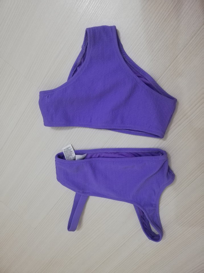 Mor renkli, asimetrik askılı ve mini kesim, sade ve şık görünümlü kadın bikini