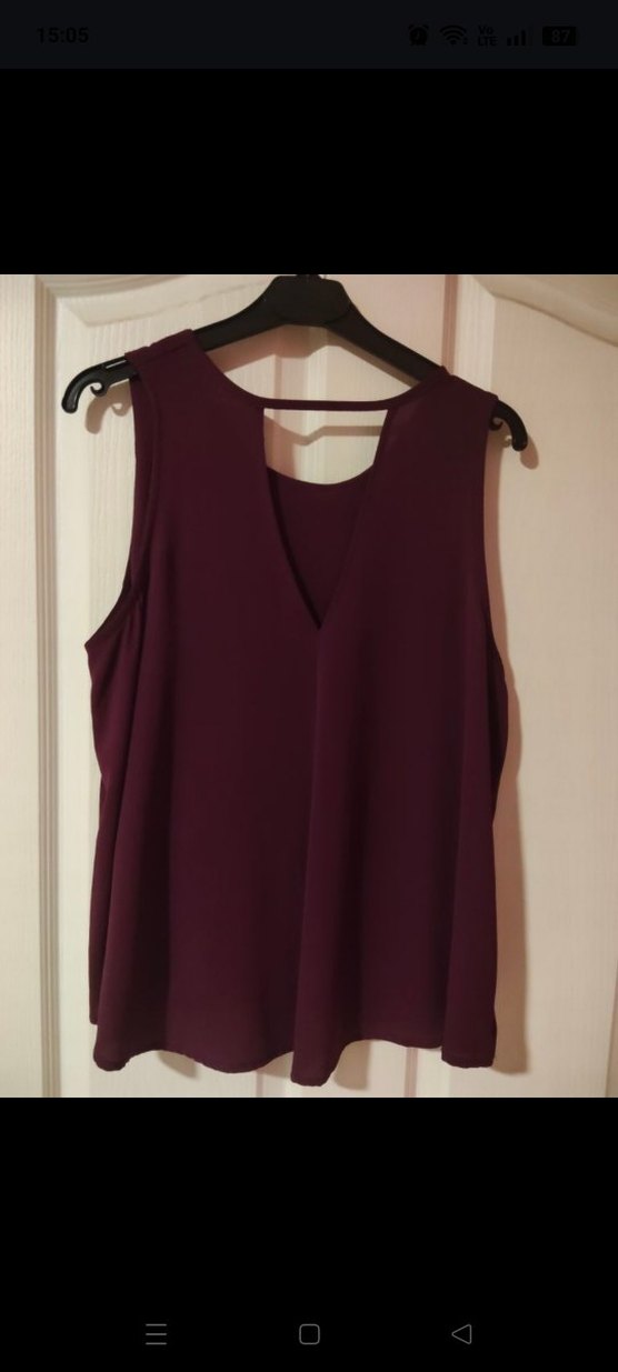 Mor renkte, V yakalı ve kolsuz, salaş kesim kadın bluz.Streetbox marka m beden kusursuz
