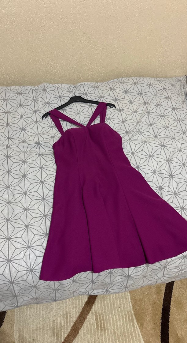 Bu mor askılı midi elbise, V yakalı ve drapeli detaylıdır. Çağdaş, minimal ve parti için uygun şık bir modeldir.