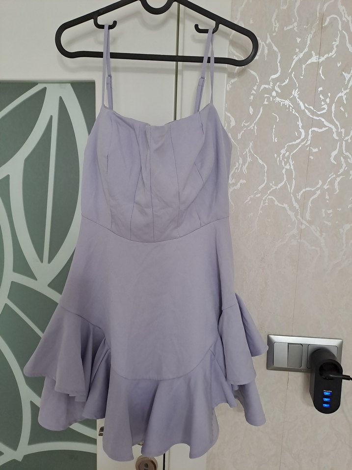 Mor renkte, askılı ve straplez yaka detaylı, etek kısmında volanlı, vücuda oturan sentetik kumaştan mini elbise. Minimalist sokak stili için uygun.