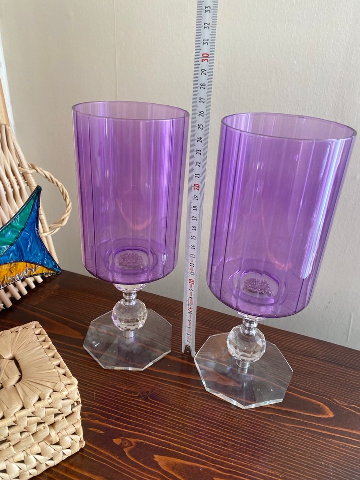 Şeffaf, çokgen tabanlı ve ayaklı, açık mor renkte ikili kadeh mumluk