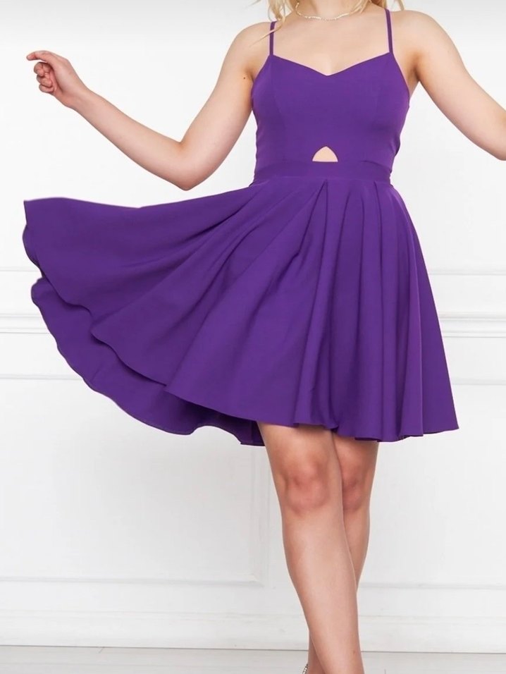 Ayarlı ince askılı, straplez yaka ve pileli kloş kesim mor mini elbise. Parlak sentetik kumaştan, cesur parti stilleri için uygundur.