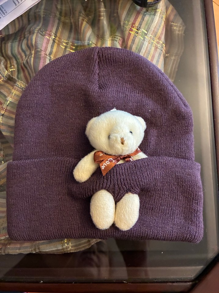 Pastel mor renkte, manşet kısmında küçük beyaz peluş ayıcık detaylı örgü bere.
