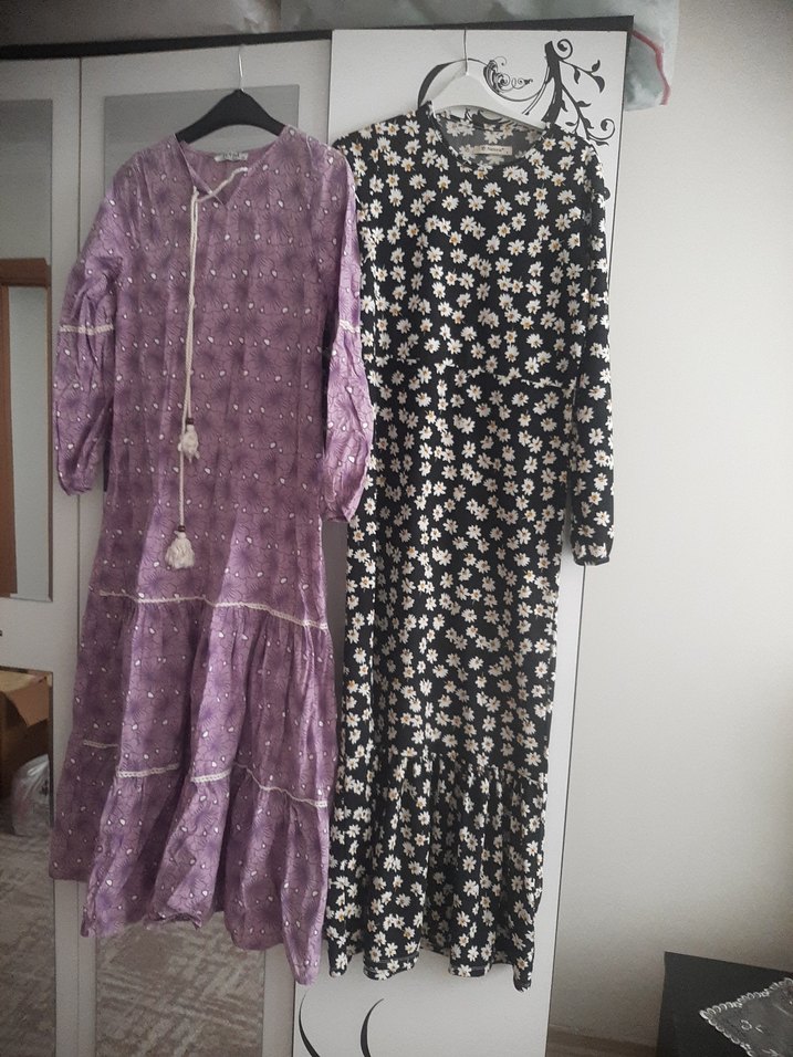Mor bağcıklı uzun elbise, bol kesim ve batik desenli. Dantel detayları, yüksek yaka ve ince askılarıyla bohem tarzı yansıtıyor.