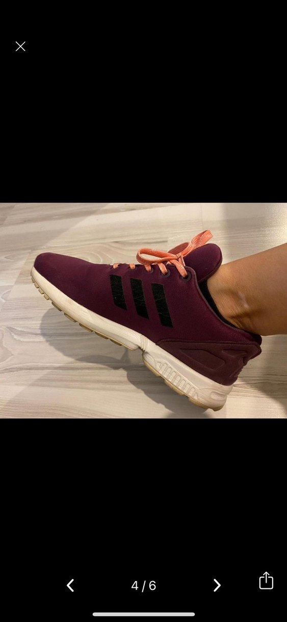Mor renkli, siyah şeritli ve pembe bağcıklı kadın spor ayakkabısıdır. Düz kauçuk tabanı rahatlık sağlar, sportif ve sokak tarzı için uygundur.
