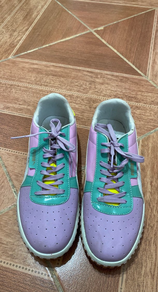 Mor tonlarında bağcıklı kadın spor ayakkabısı, blok topuklu ve bağcıklı tasarıma sahip. Günlük kullanıma uygun, lastik tabanlı ve batik desenli.