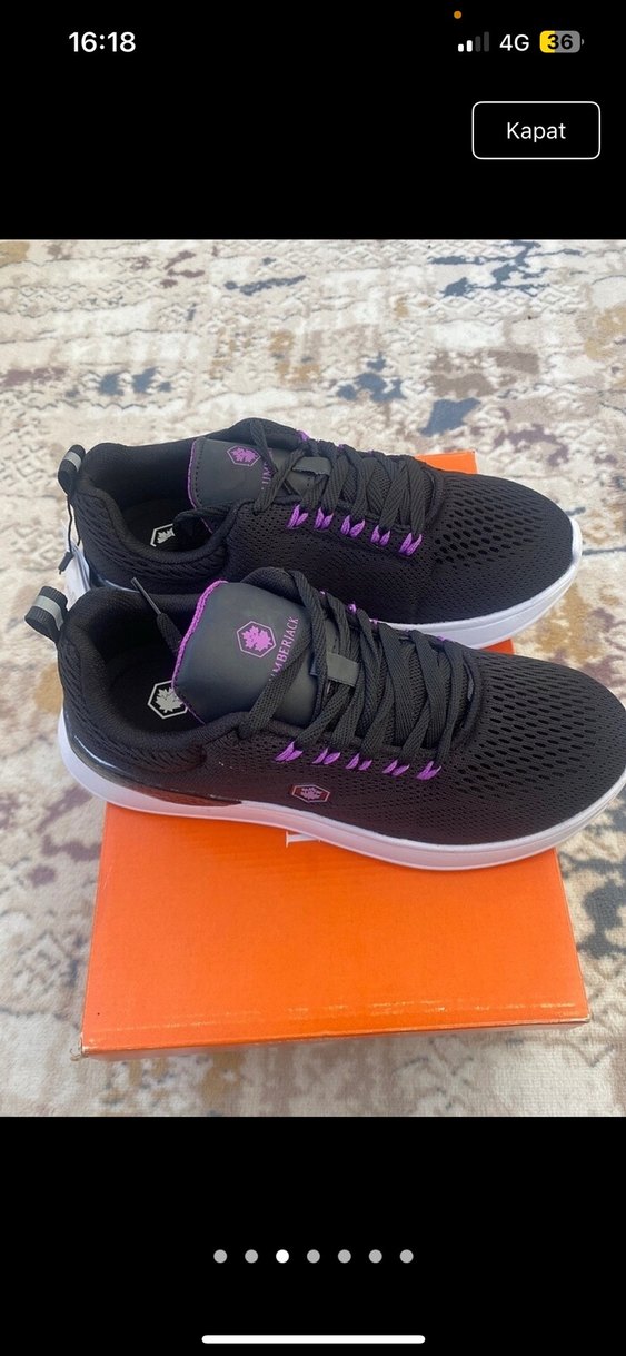 Mor bağcıklı, bağcıklı ve stiletto topuklu kadın spor ayakkabısı. Kauçuk tabanlı, sokak stili ve spor için uygun. 1/2 defa giyildi