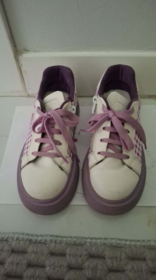 Mor bağcıklı, pastel kare desenli spor ayakkabılar. İnce topuklu ve kauçuk tabanlı, günlük sokak stili için uygun.