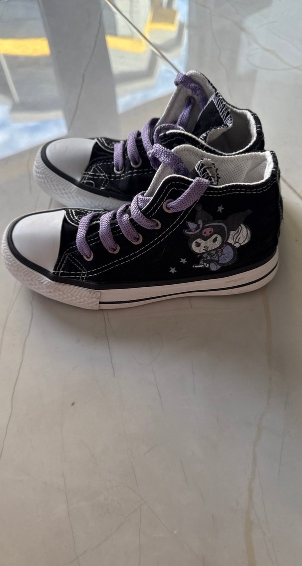 Mor bağcıklı, gotik desenli kız çocuk spor ayakkabısı. Kauçuk tabanlı ve kolay kullanım için cırt cırtlıdır. Sadece 1 kere doğum gününde kullanıldı