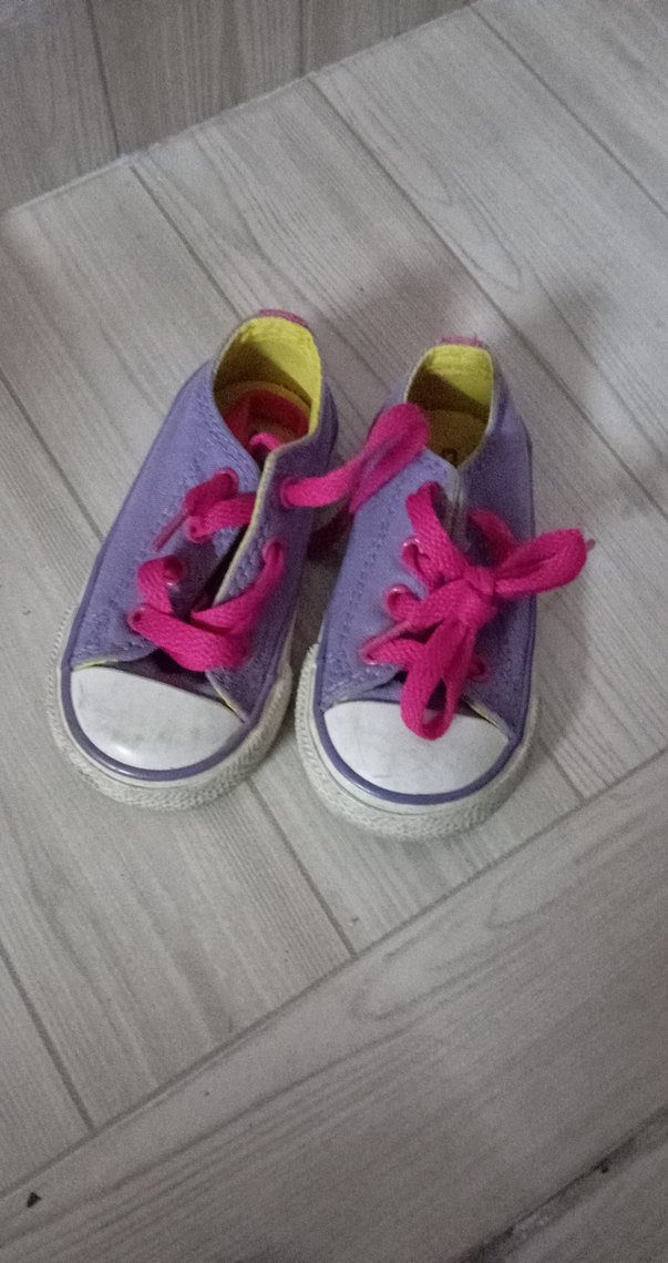 Mor renkli, bağcıklı ve renkli batik desenli kız çocuk spor ayakkabısı. Kolay kullanım için cırt cırtlı, kauçuk tabanlı.