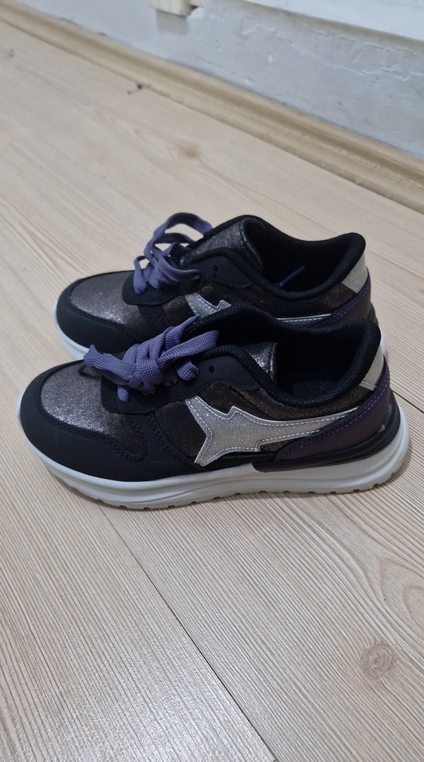 Mor renkli, bağcıklı, ince topuklu kiz cocuk spor ayakkabısı. Kauçuk tabanlı, spor ve sokak stili için uygun, rahat ve şık. hic kullanılmadı sıfır ürün.