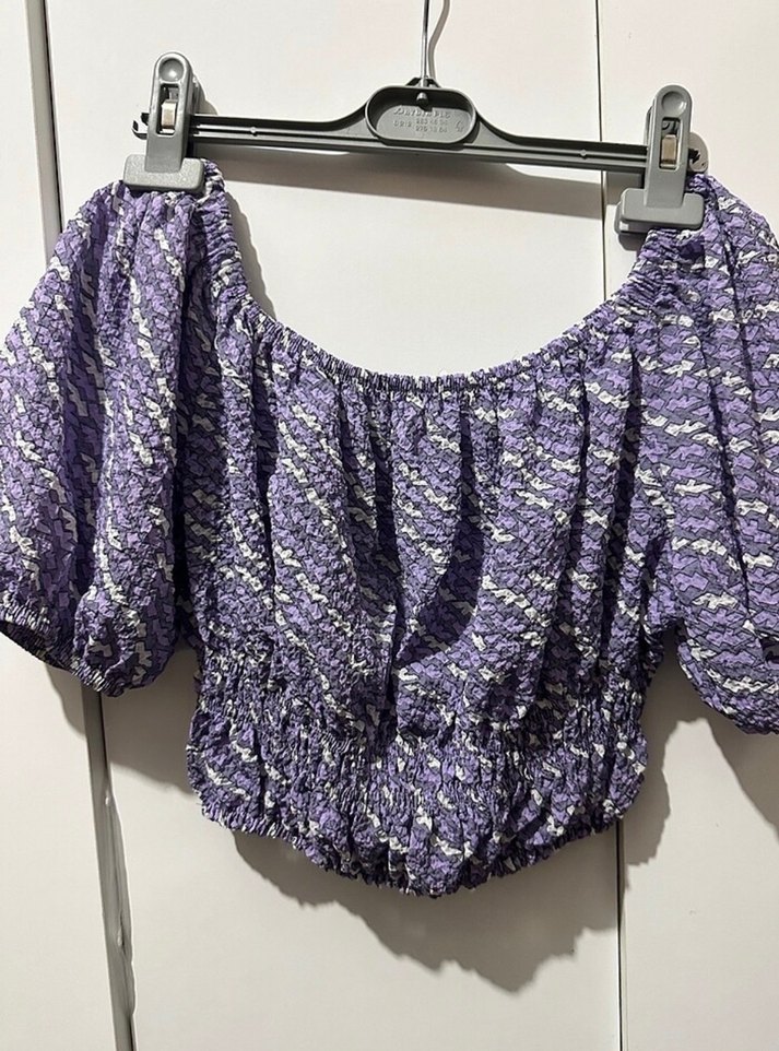 Mor bağcıklı mini bluz, tekne yakalı, fırfırlı ve gevşek kesimdir. Strappy kollu, bohem tarzı için uygundur. Sadece yıkandı fakat hiç giyilmedi Marka temsilidir