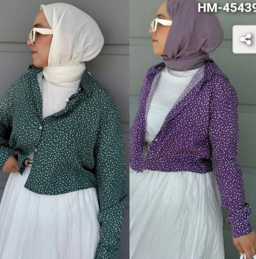 Pamuklu, uzun kollu, düğmeli bolero. Yüksek yakalı, bol kesim ve açık mor bağcıklı desene sahip. Modest sokak stili için uygun. Marka: HM.