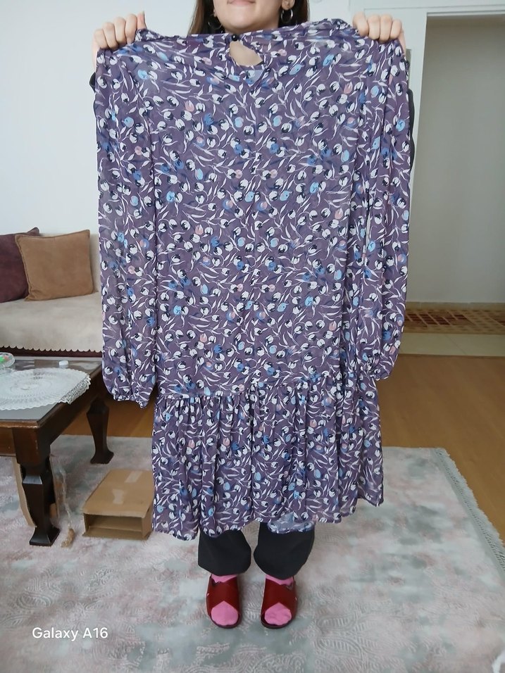 Mor bohem tarzı hamile tunik, uzun kollu, yuvarlak yakalı ve bağcıklı desenli. Yumuşak sentetik kumaştan, salaş kesim ve midi boyda, günlük kullanıma uygun.