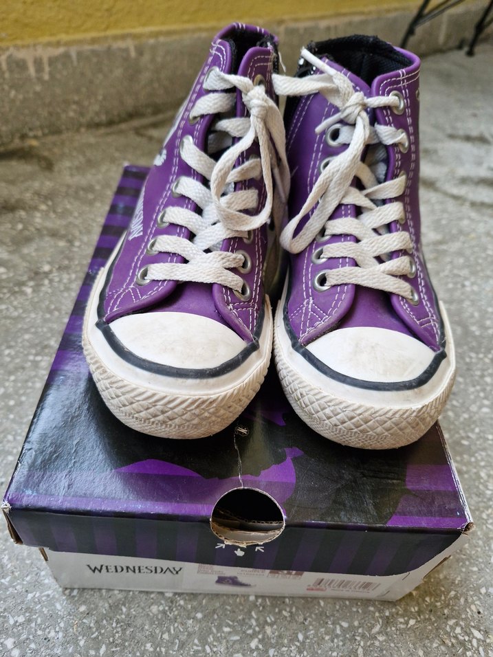 Fermuarlı ve bağcıklı, mor spor ayakkabı. #convers #flo #bot "WEDNESDAY" yazılı, rock punk tarzında.