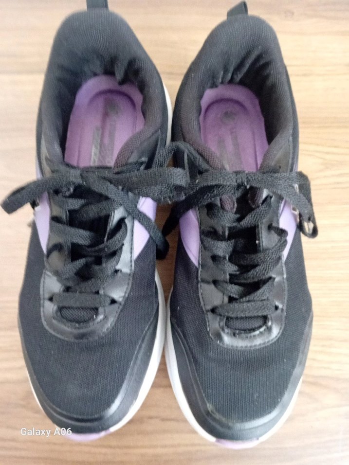 Mor ve siyah renklerde, bağcıklı stiletto topuklu kadın spor sneaker, spor ve sokak stili karışımı, defosu fotoğraflarda mevcut.