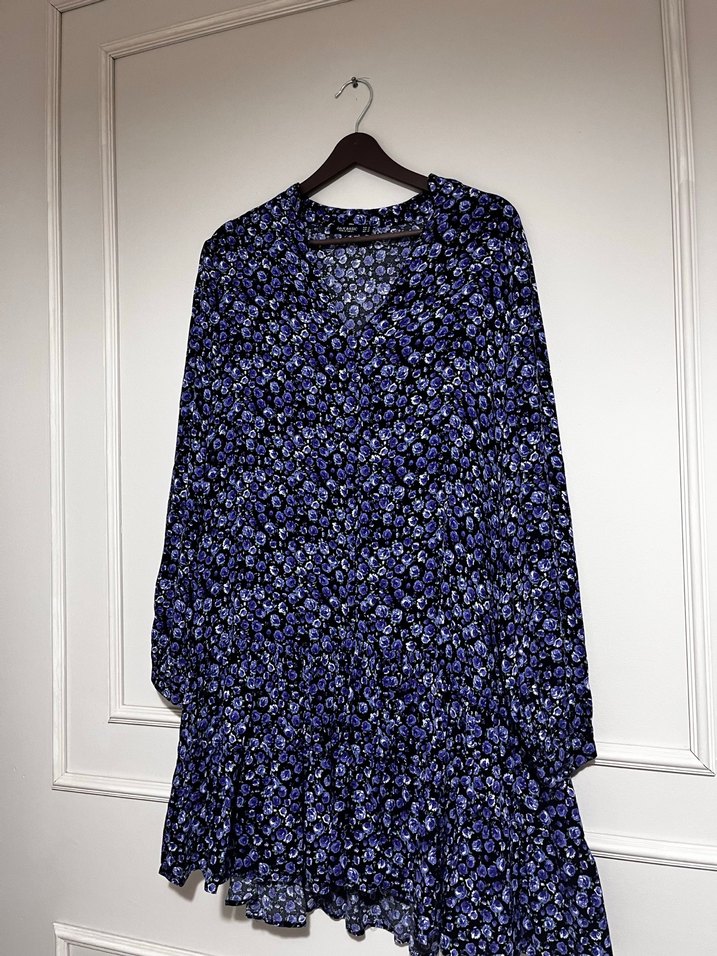 Mor uzun kollu, bol kesim ve drapeli V yakalı bağcıklı elbise, yumuşak sentetik kumaştan yapılmıştır.