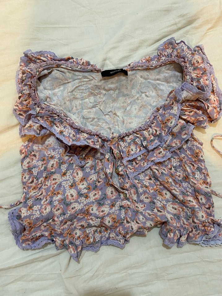 Mor Bağcıklı Volanlı Bohem Bluz