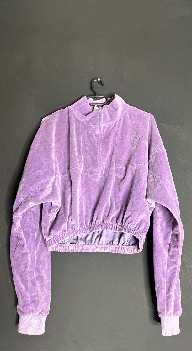 Pastel mor renkte, yumuşak kumaştan, uzun kollu ve yüksek yakalı sweatshirt. Bağcıklı fermuarlı ve bol kesim, bağlama deseniyle rahat bir sokak stili sunar.