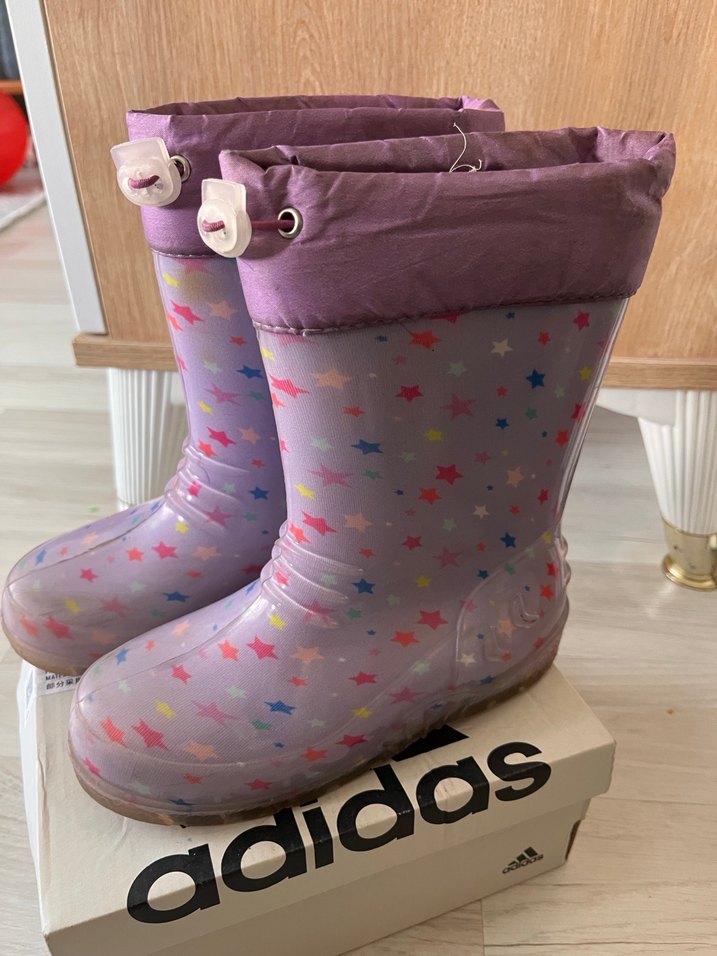 Mor kauçuk kız yağmur çizmesi, pastel tonlarında yıldız desenli ve ayarlanabilir cırt cırtlı bantlıdır. Rahat ve kolay kullanımlıdır.