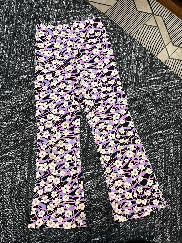 Mor bağlama desenli, dantel detaylı, uzun paçalı ve ispanyol paça kadın pantolon, bohem ve rahat sokak stili için uygundur.
