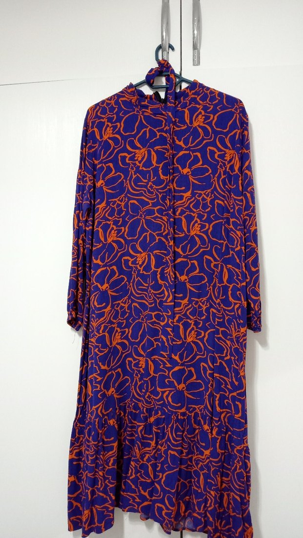 Mor bağlama desenli, uzun ve bol kesim kadın elbisesi. Uzun kollu ve yüksek yakalı, ipeksi dokulu bohem tarzda.