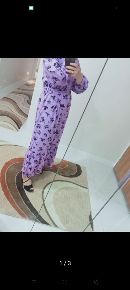 Mor pastel bağlama desenli, uzun, salaş kesim elbise, drapeli uzun kollu ve yüksek yakalı, günlük sokak stili için uygun.