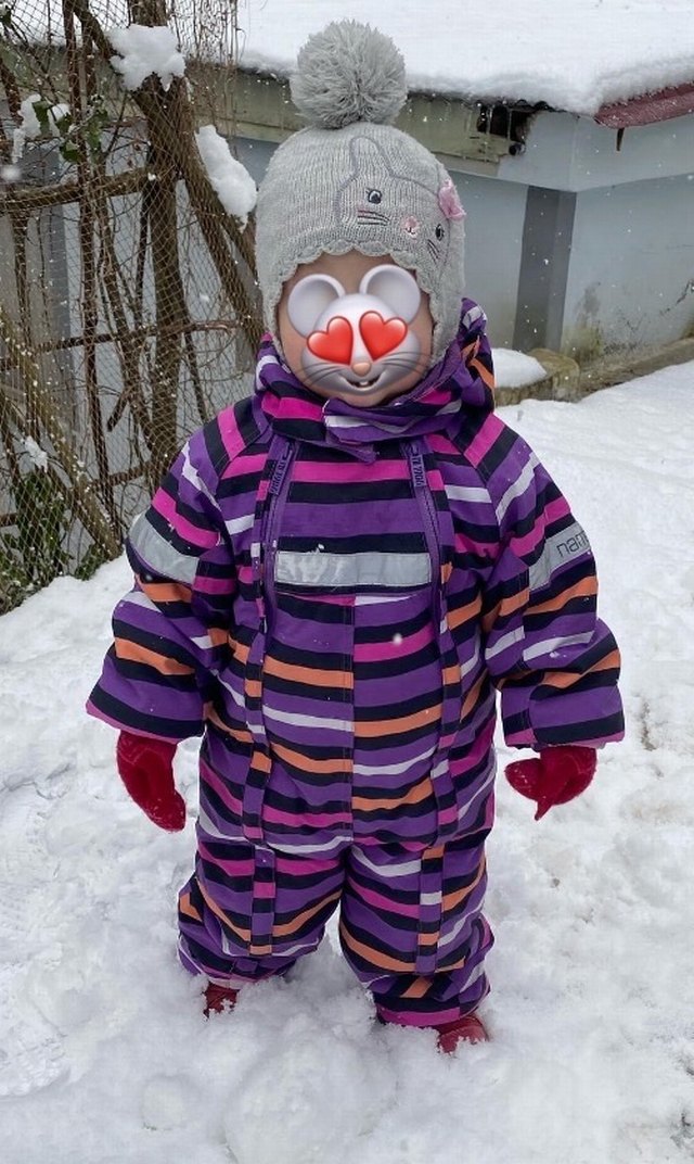Mor, gri ve turuncu bağlamalı desenli çizgili bebek tulumu, örme boğazlıdır. ❄️