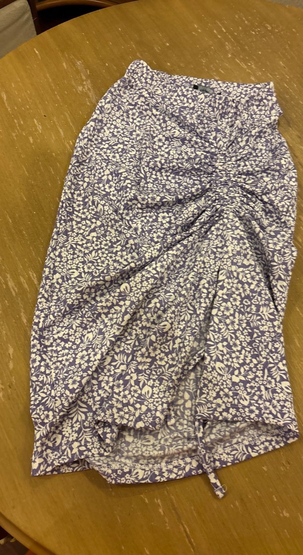 Yumuşak sentetik kumaştan, mor bağlamalı desenli, drapeli, uzun ve vücuda oturan etek. Bohem ve retro tarzını yansıtır, günlük kullanım için uygundur.