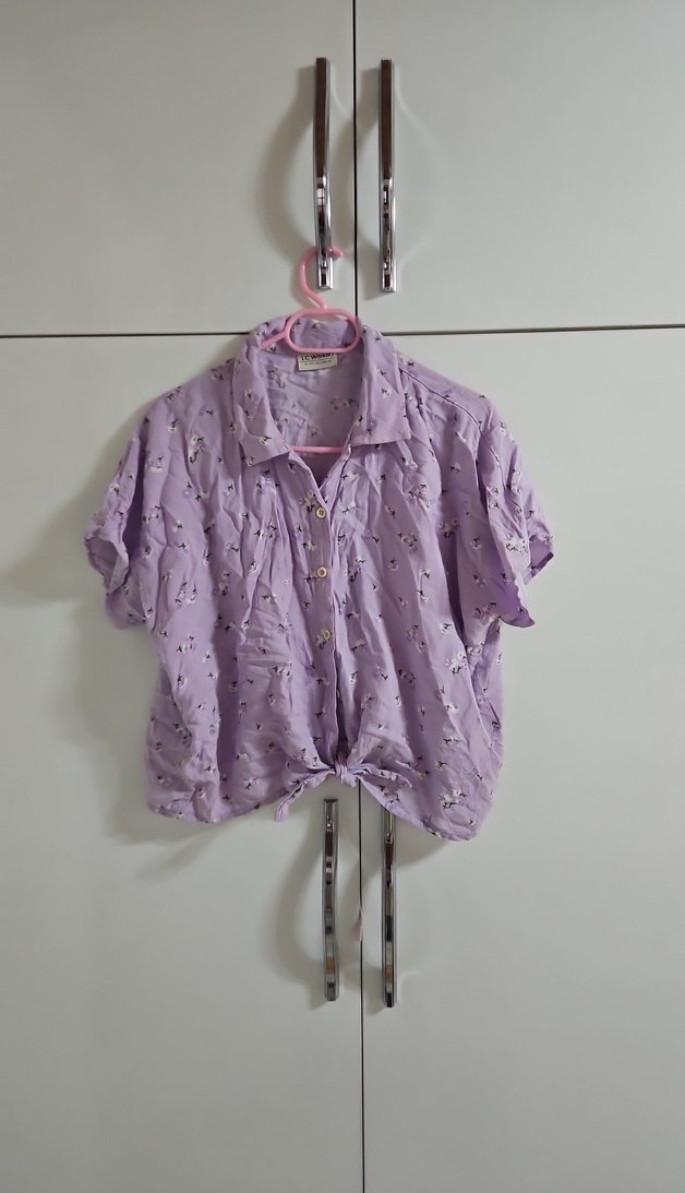 Pamuk kumaştan, kısa kollu ve düğmeli, yakalı, bağlamalı, midi uzunlukta, pastel mor batik desenli, bol kesim kadın gömlek. utüsüz ama yenidir
