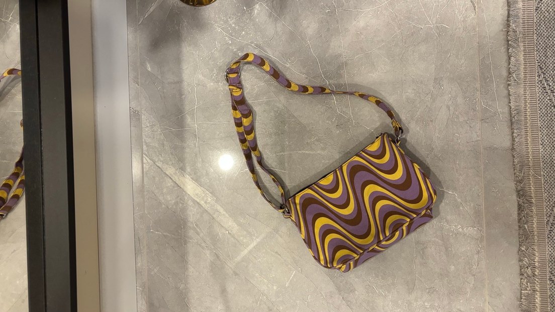 Mor tonlarında bağlamalı ayarlanabilir askıya sahip kadın çantası. Sentetik kumaştan, bohem ve retro tarzlara uygun, günlük kullanıma ideal.