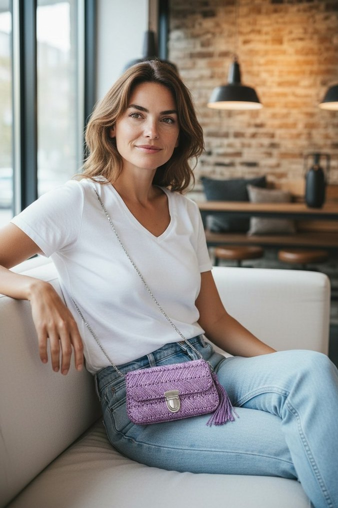 Pastel mor renkli, bağlamalı püsküllü kanvas kadın çantası, gündelik kullanım için rahat ve şık bir tasarıma sahiptir.