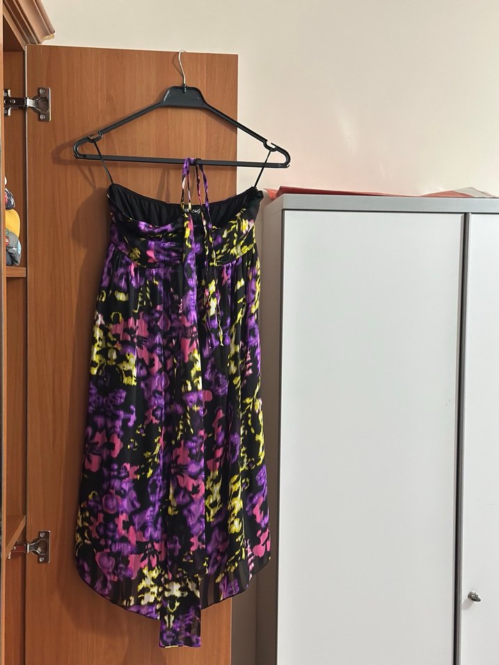 Mor bağlamalı mini elbise, straplez yaka ve bol kesim. Drapeli detaylı, romantik akşamlar için ideal.