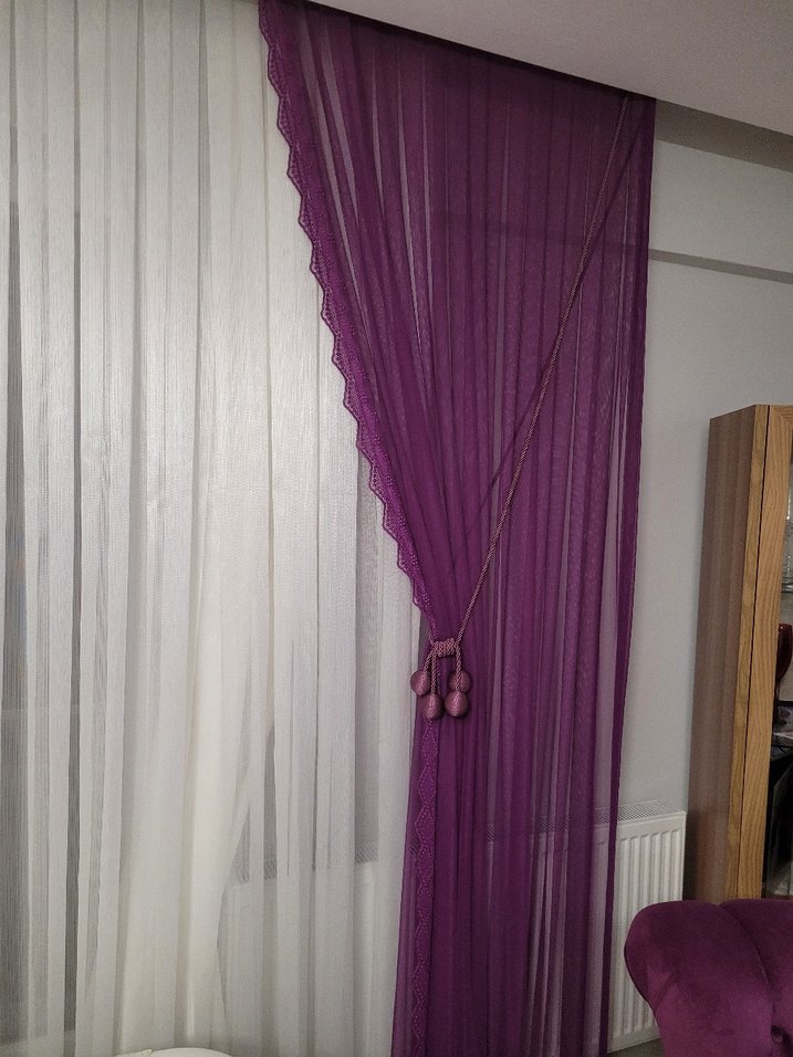 Hafif mor tonlarında, bağlamalı, klasik tarzda, bağlama detaylı tül perde. Odaya zarif ve yumuşak bir hava katar.
