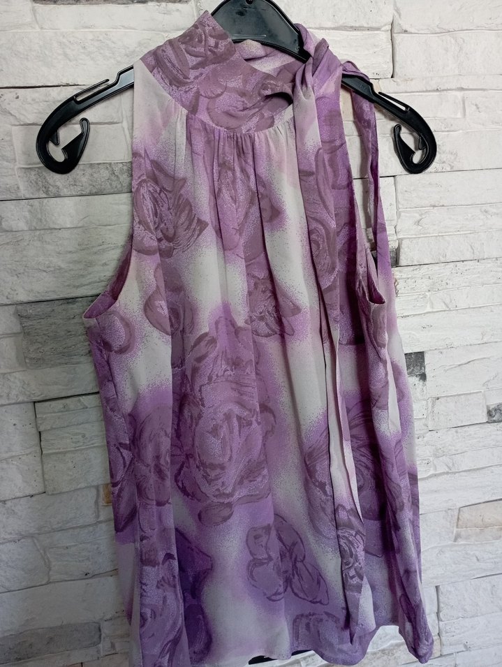 şifon kumaştan, mor pastel tonlarda bağlamalı yakalı, kolsuz, dökümlü ve bol kesim bluz.