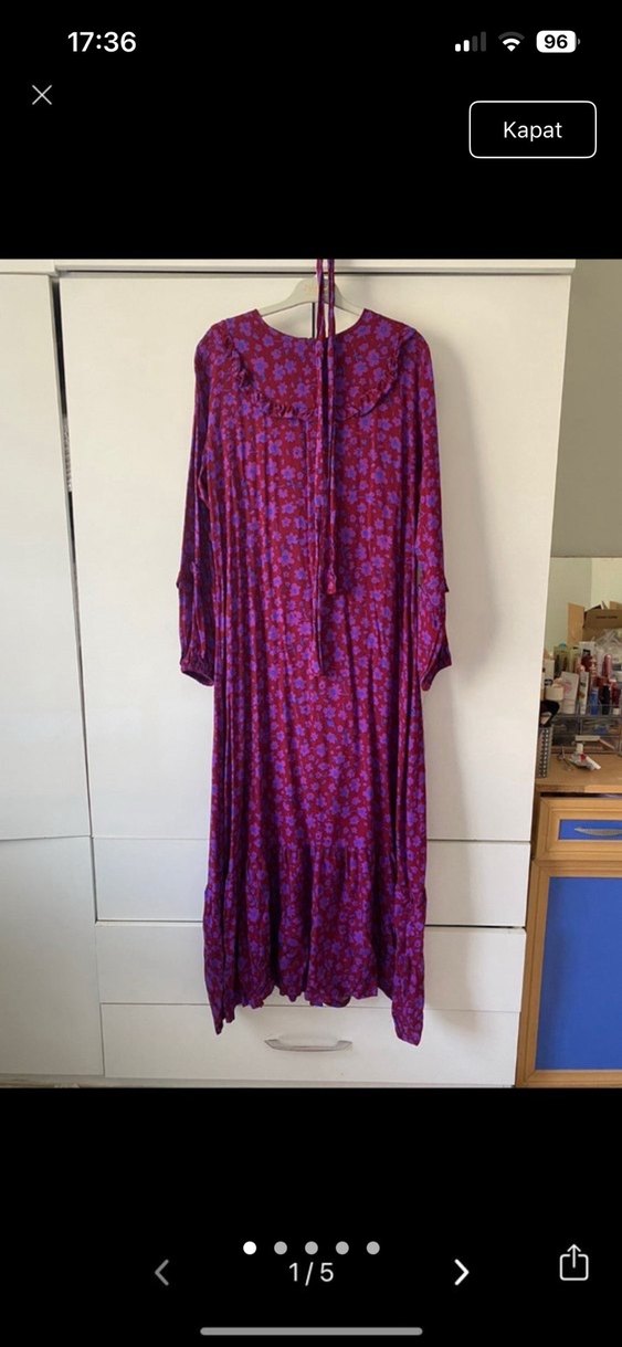Mor bağlamalı yakalı, uzun kollu, bol kesim bohem elbise. İpeksi kumaştan, dökümlü ve koyu renkli bağlama deseni ile romantik akşamlar için uygun.