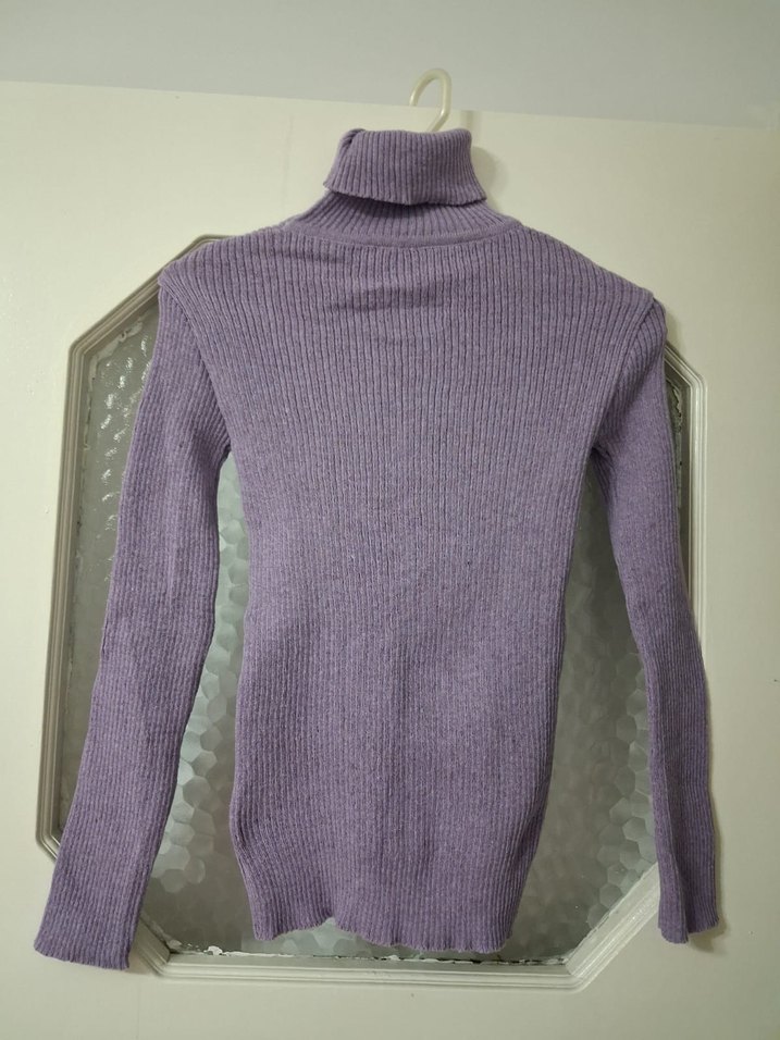 Mor renkli, balıkçı yaka ve uzun kollu, vücuda oturan triko kazak. Yumuşak dokusu ve düz deseniyle günlük kullanıma uygundur. hiç kullanılmadı standart beden
