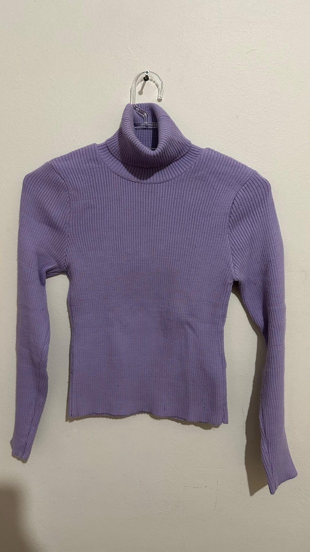 Mor renkte, balıkçı yaka ve uzun kollu, fit kesim örme kadın kazak. Minimalist ve desen içermeyen günlük kullanım için uygun. Bedeni olmuyor artık o yüzden elden çıkarıyorum. Defo yok.