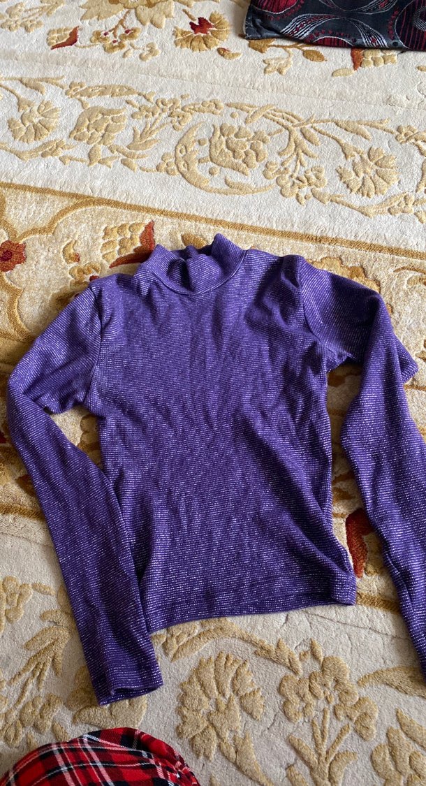 Mor balıkçı yaka ve uzun kollu, rahat kesim triko kazak. Keten kumaştan örülmüş, parlak dokusu ve bohem tarzıyla günlük kullanıma uygun.