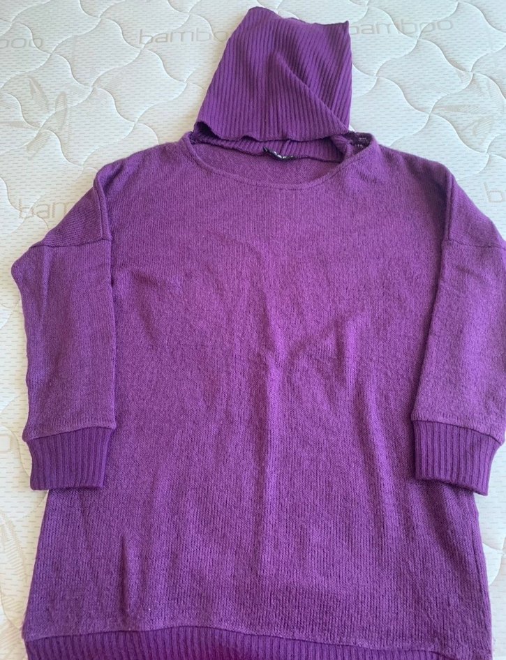 Mor renkte, balıkçı yaka ve uzun kollu örme kadın kazak. Rahat, normal boyda, sade ve koyu tonlarda günlük kullanıma uygun.