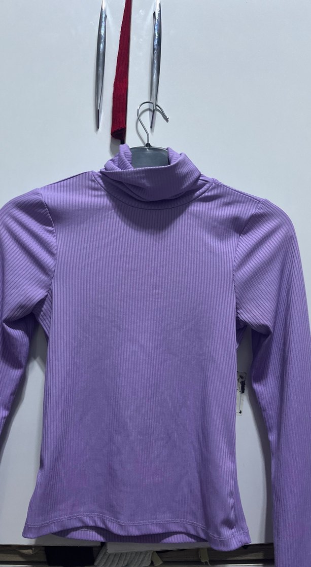 Mor renkli, balıkçı yaka ve uzun kollu, vücuda oturan pilili triko, yumuşak sentetik kumaştan günlük kullanıma uygundur.