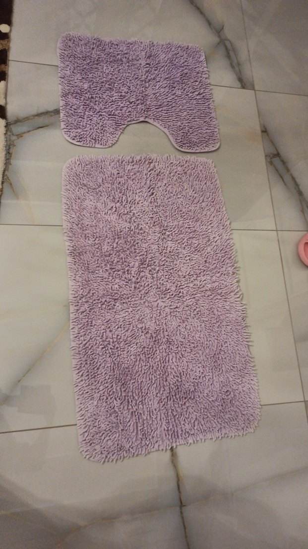Pastel mor renkte, yumuşak ve emici dokulu iki parça banyo paspası seti. Biri dikdörtgen, diğeri klozet altına uygun şekildedir.