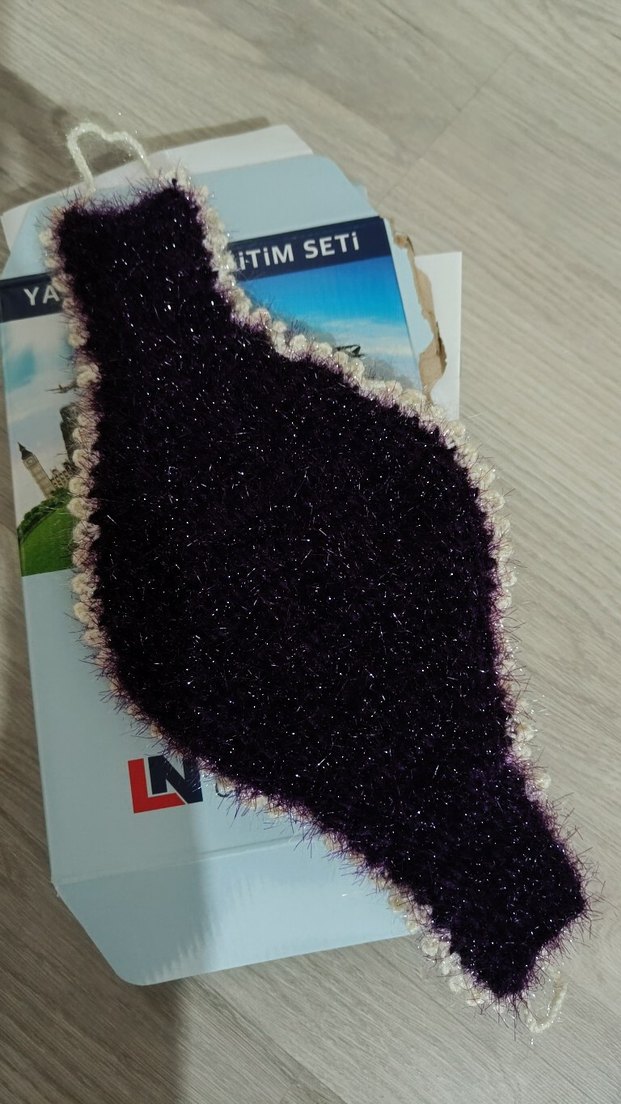 Koyu mor renkte, dokulu yüzeye ve asma halkasına sahip banyo süngeri. Cilt temizliği ve peeling için uygundur. üçü dahil fiyattr